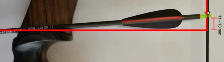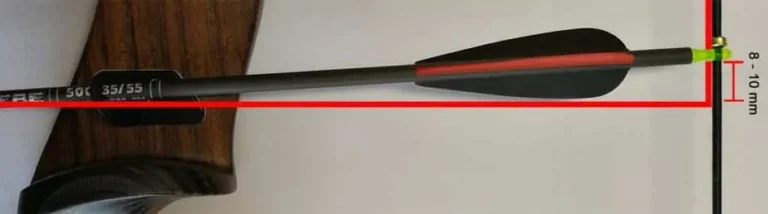 Die Höhe der Pfeilauflage steht in direktem Zusammenhang mit dem Nockpunkt auf der Sehne. Der Abstand zwischen Pfeilauflage und Nockpunkt sollte so gewählt werden, dass der Pfeil leicht nach unten zeigt, also Richtung Boden. Typische Werte liegen zwischen 8 und 13 Millimeter über der 90-Grad-Linie.